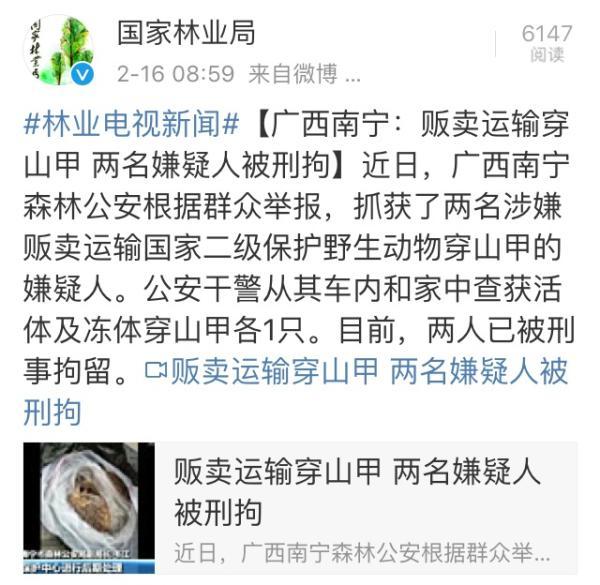 2017年2月16日上午,国家林业局官方微博证实了这一消息。该微博称,近日,广西南宁森林公安根据群众举报,抓获了两名涉嫌贩卖运输国家二级保护野生动物穿山甲的嫌疑人。公安干警从其车内和家中查获活体及冻体穿山甲各1只。目前,两人已被刑事拘留。