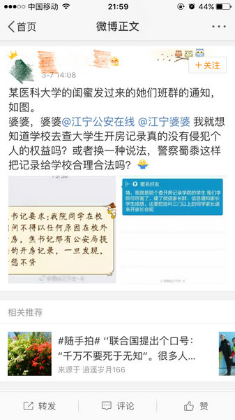 3月7日,有网友发微博称,自己同学接到班群通知,院系领导禁止学生在校外开房,并称有公安局提供的开房记录。