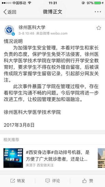 3月8日,徐州医科大学就此事发布情况说明称,为加强学生安全管理,本着对学生和家长负责的态度,保护学生免受不法侵害,徐州医科大学医学技术学院在学期初例行开学安全教育时,要求学生不得在校外擅自留宿,后被误传成院方掌握学生留宿记录,引起部分网友关注。