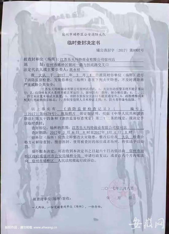 中安在线讯 据安徽网报道,3月6日,宿州市埇桥区公安消防大队向江苏乐天玛特商业有限公司宿州店下达临时查封决定书,为期一个月。