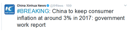 据新华英文报道,中国2017年GDP增长目标为6.5%左右,CPI涨幅控制在3%左右。?