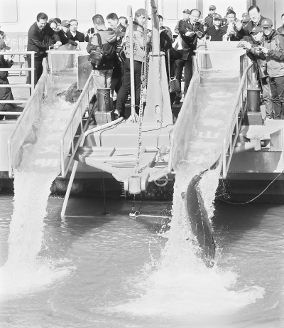 长江日报记者现场看到,身长1.2米、体重达200斤的一条中华鲟首先被放流,只见它在池里摇头摆尾不断拍打着水花,随着放流通道滑溜下去,然后“扑通”一声消失在长江中。舰艇上,运输工人用小型起重机小心翼翼地搬运着将要放流的中华鲟。现场吸引了不少市民围观拍照。