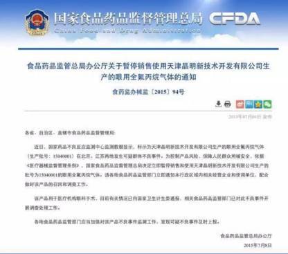 2015年7月8日,国家食品药品监督管理总局发布紧急通告,标示为天津晶明新技术开发有限公司生产的眼用全氟丙烷气体(生产批号:15040001)在北京、江苏两地发生可疑群体不良事件,国家食品药品监督管理总局决定立即暂停销售和使用天津晶明新技术开发有限公司生产的批号为15040001的眼用全氟丙烷气体。