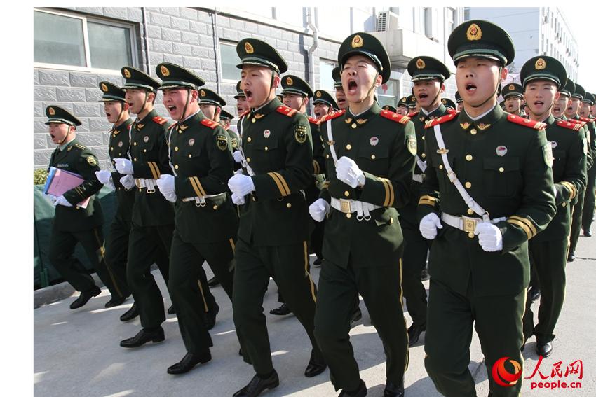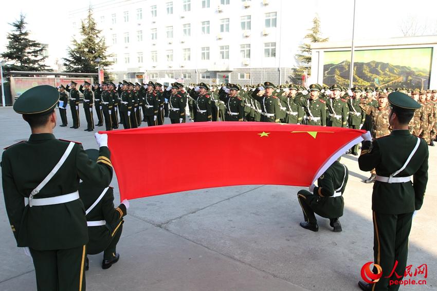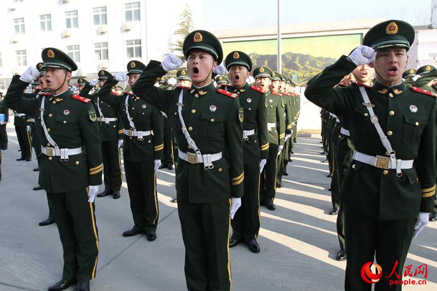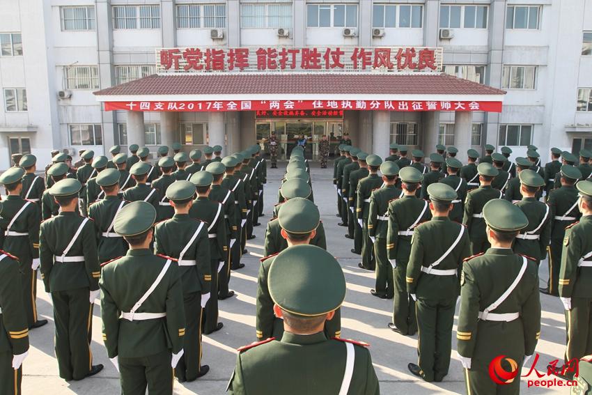 人民网北京2月27日电 “听党指挥,忠于使命,誓保安全,决战决胜……”27日上午,武警北京总队十四支队举行“两会”住地执勤分队出征誓师大会,百余名参战官兵面向国旗庄严宣誓,铮铮誓言响彻营区。