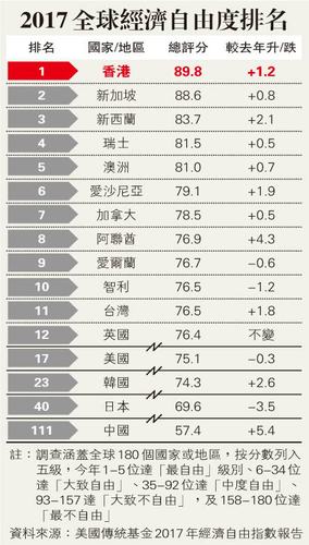 更为可贵的是,香港总分在连续两年下跌后回升,与排名第二的新加坡差距进一步拉开。而其他国家,瑞士排名第4、英国排名第12、美国排名第17,日本则列在第44位。营商自由、产权保障、税务负担、贸易自由、投资自由、劳工自由等方面,香港都是全球领先。