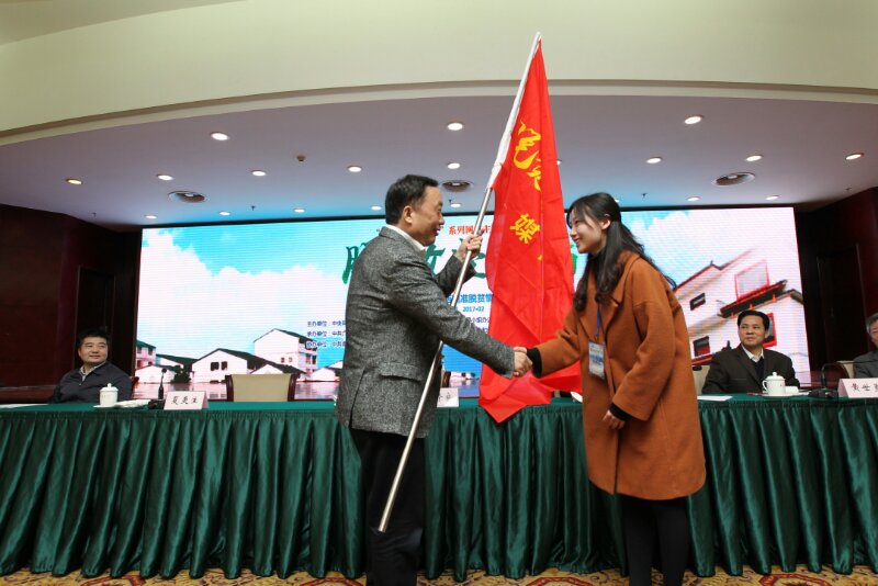中央网信办副主任、国家网信办副主任任贤良为媒体团授旗。