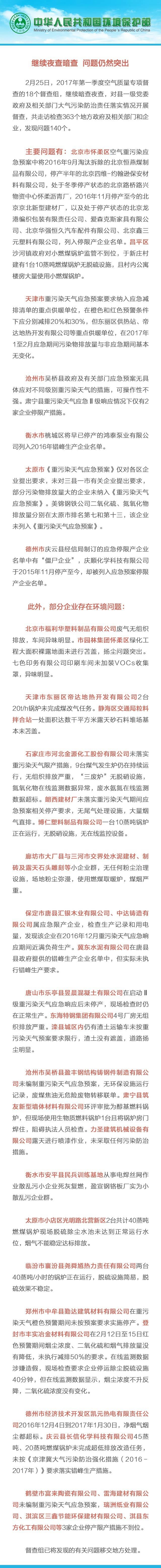 通报称,2017年第一季度空气质量专项督查18个督查组继续暗查夜查,对县一级党委政府及相关部门大气污染防治责任落实情况开展督查,共走访检查363个地方政府及相关部门和企业,发现问题140个。督察组已将发现的有关问题移交地方处理。