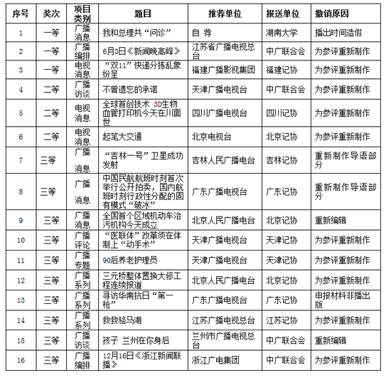 因重新制作参评作品等情况被撤销获奖资格的作品目录