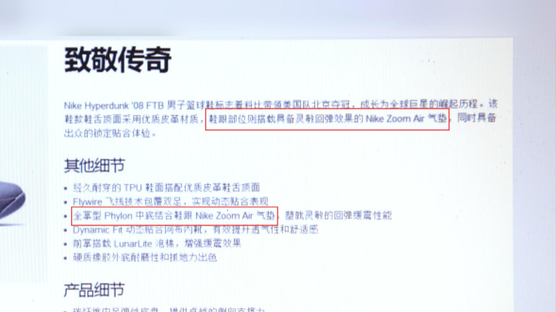 NIKE在中文官网上宣称,这款鞋后跟带有NIKE拥有专利的zoom air气垫。然而,郎先生穿上这双鞋,上了球场,就觉得有点不对劲。