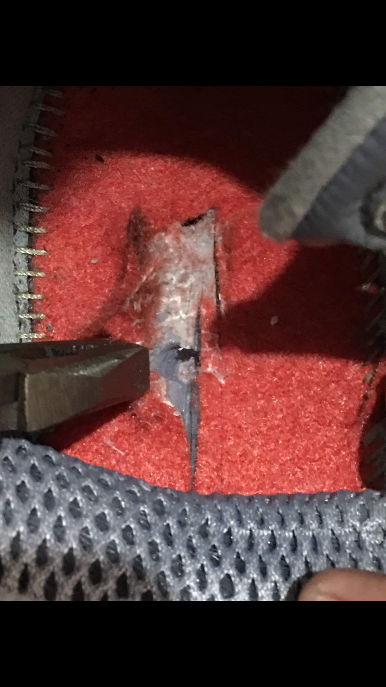 带有zoom air气垫的鞋,怎么会硬呢。一直爱穿NIKE篮球鞋的郎先生,觉得有些奇怪,于是,他在鞋的后跟位置切开了一个小口。