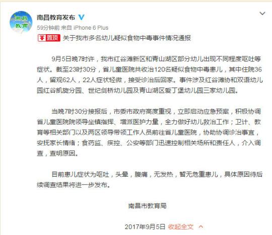 9月5日晚7时许,我市红谷滩新区和青山湖区部分幼儿出现不同程度呕吐等症状。截至23时30分,省儿童医院共收治120名疑似食物中毒患儿,其中住院36人,留观62人,22人症状轻微,接受诊治后回家。事件涉及红谷滩协和双语幼儿园红谷凯旋分园、世纪剑桥幼儿园及青山湖区爱丁堡幼儿园三家幼儿园。