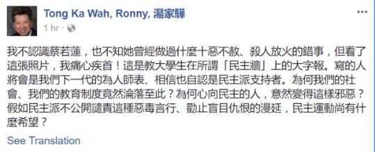 许多香港社会名流也对这一言论表达了愤怒之情,比如香港知名大律师汤家骅就在他的Facebook页面上写到: