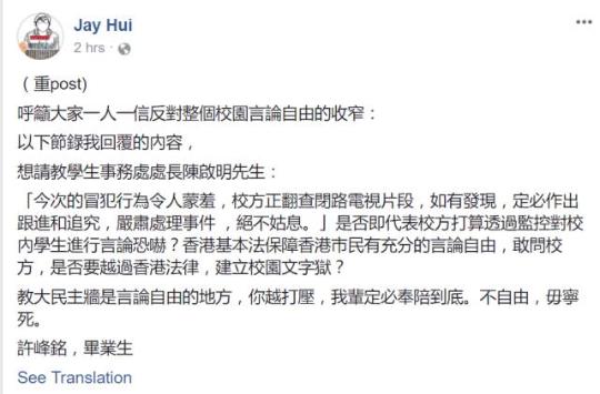 不过,令耿直哥觉得最魔幻的是,一名香港教育大学的毕业生以及该校前学生会的“副主席”,居然拿出“民主自由”的大棒,宣称学校要查找谁发布这番恶毒言论的做法是 “要对学生进行恐吓”和“文字狱”,还说自己必会捍卫校园民主墙的“言论自由”,与学校“奉陪到底”。