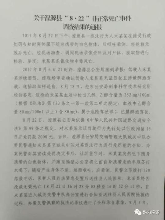 8月22日,湟源县公安局依据《中华人民共和国道路交通安全法》第99条之规定,对米某某无证驾驶行为先行处以行政拘留15日并处罚款2000元。当日,湟源县公安局交通管理大队城关中队办案民警通知米某某至城关中队对其违法行为进行处罚前的告知,办案民警向其宣读处罚决定书后,让其签字时,米某某突然吃下随身携带的白色物体,并跑至隔壁办公室将之前自身携带来的半瓶苏打水喝下,随后产生身体不适,继而呕吐,后晕倒。民警立即拨打120急救电话,医护人员到场紧急处置后送往县人民医院,米某某终因抢救无效死亡(8月22日16时28分03秒至16时52分16秒,自米某某进入城关交警中队办公室进行告知至送往县人民医院抢救的过程,办案民警佩戴的执法记录仪进行了全程录音录像,9月5日、6日死者家属及委托律师在公安机关向其通报有关调查情况时查看了视频)。