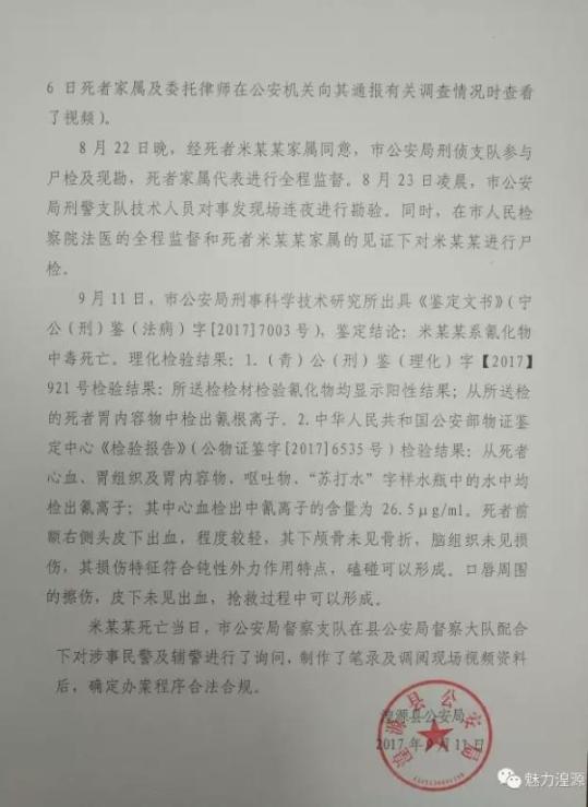9月11日,市公安局刑事科学技术研究所出具《鉴定文书》(宁公(刑)鉴(法病)字[2017]7003号),鉴定结论:米某某系氰化物中毒死亡。理化检验结果:1.(青)公(刑)鉴(理化)字【2017】921号检验结果:所送检检材检验氰化物均显示阳性结果;从所送检的死者胃内容物中检出氰根离子。2.中华人民共和国公安部物证鉴定中心《检验报告》(公物证鉴字[2017]6535号)检验结果:从死者心血、胃组织及胃内容物、呕吐物、“苏打水”字样水瓶中的水中均检出氰离子;其中心血检出中氰离子的含量为26.5μg/ml。死者前额右侧头皮下出血,程度较轻,其下颅骨未见骨折,脑组织未见损伤,其损伤特征符合钝性外力作用特点,磕碰可以形成。口唇周围的擦伤,皮下未见出血,抢救过程中可以形成。