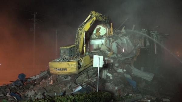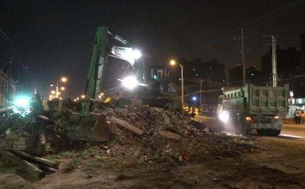 整个房屋的拆除工作耗时约90分钟。其间,两支高压水枪一直在往建筑内喷水,以减少拆除时产生的灰尘。大约从1点25分开始,土方车开始将废渣陆续运走,松江区九里亭街道动迁办主任陆辉对澎湃新闻(www.thepaper.cn)记者介绍,清运工作会持续到18日早6时。拆除期间,沪亭北路从18日0点到2点实施封路。