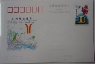 广州地铁1号线首段于1997年6月28日上午10时正式开通,邮电部发行纪念邮资片一枚,邮资图为地铁和广州市市花木棉花,片图为广州地铁地图。