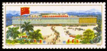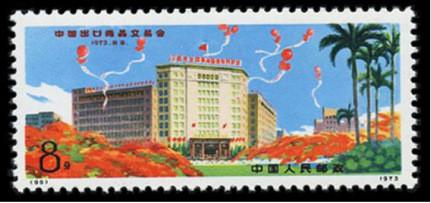 1974年10月15日,为了祝贺中国秋季出口商品交易会开幕,邮电部发行了T6《中国出口商品交易会》邮票。这套邮票表现的是建于1974年的流花路新展馆,建筑面积17万平方米。