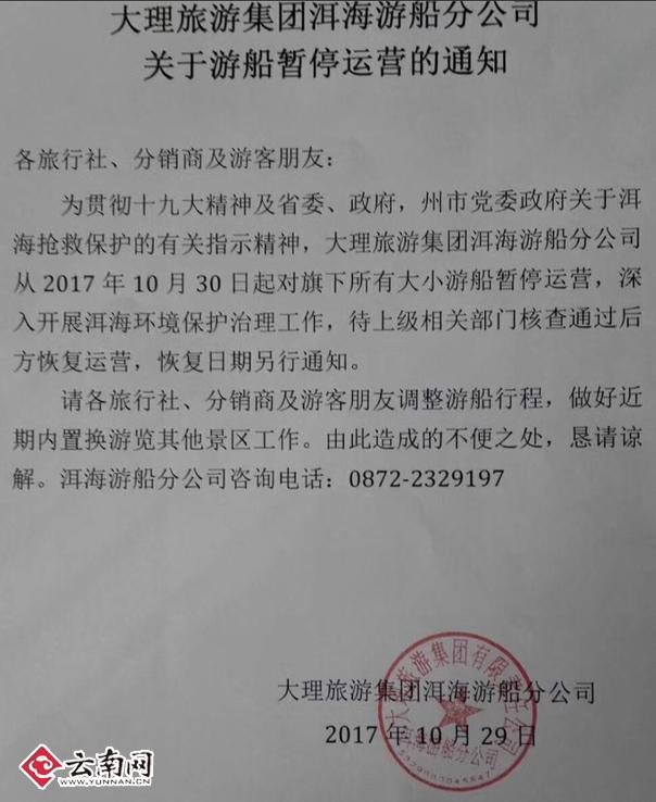 随后,大理旅游集团有限责任公司游船分公司王副经理向云南网(微信公号:yunnancn )证实了上述通知的真实性。