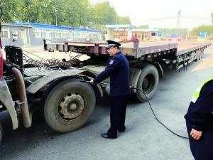 环保执法人员检查大货车污染物排放。市环保局/供图
