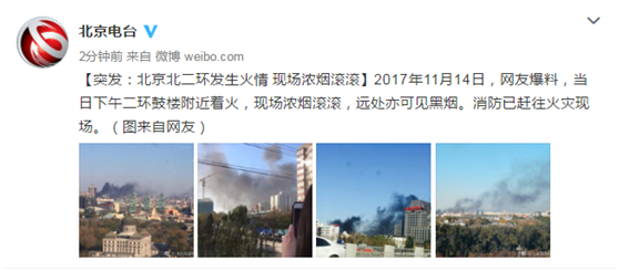 【环球网综合报道】据北京电台消息,11月14日下午,北京二环鼓楼附近着火。现场浓烟滚滚,远处也可以见到黑烟。