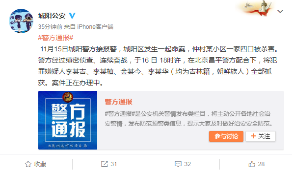 法制晚报?看法新闻 据@城阳公安官方微博发布消息,11月15日城阳警方接报警,城阳区发生一起命案,仲村某小区一家四口被杀害。警方经过缜密侦查、连续奋战,于16日18时许,在北京昌平警方配合下,将犯罪嫌疑人李某吉、李某植、金某今、李某华(均为吉林籍,朝鲜族人)全部抓获。案件正在办理中。
