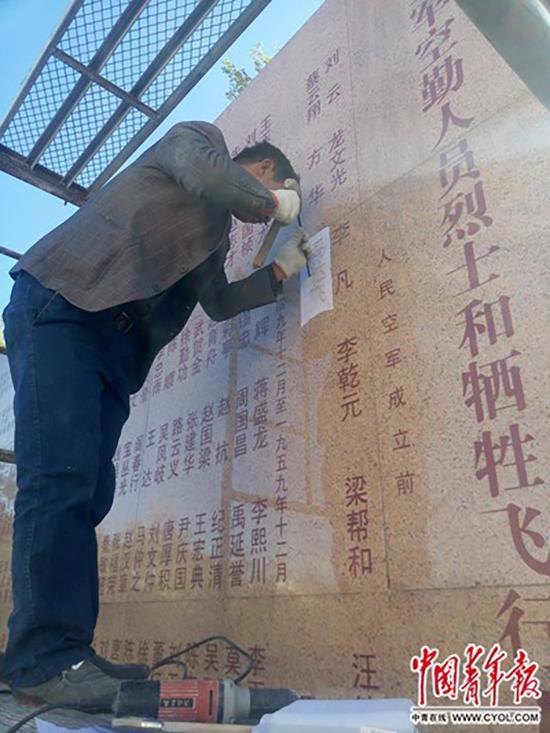 在空军英烈墙上增刻冯达飞烈士的姓名。中国青年报图