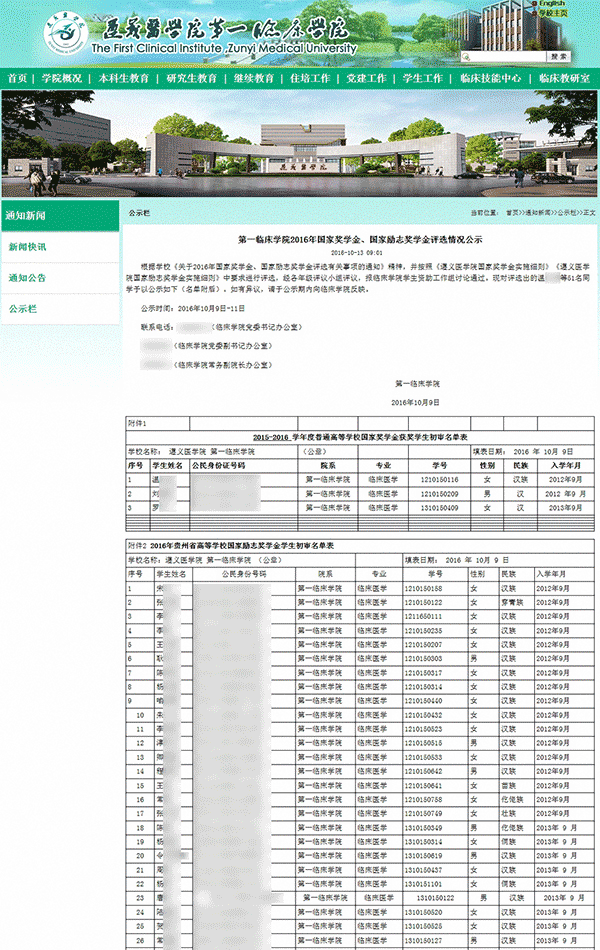 再比如,2016年10月13日,遵义医学院第一临床学院官网(www.1stci.zmc.edu.cn)发布了《第一临床学院2016年国家奖学金、国家励志奖学金评选情况公示》,公示中公布了共计51名学生的学号和身份证号。