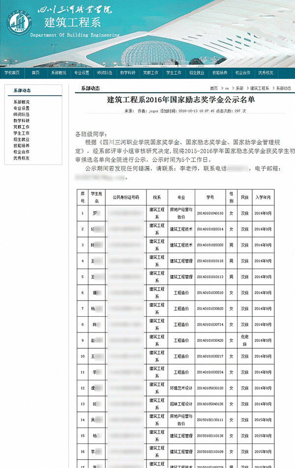 四川三河职业学院建筑工程系官网在2016年10月13日公布的《建筑工程系2016年国家励志奖学金公示名单》部分截图。图片系澎湃新闻基于保护隐私需要打码,原页面没有打码。