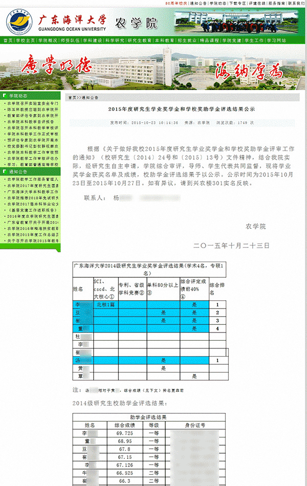 例如,广东海洋大学农学院官网(www.gdou.edu.cn)在2015年10月23日发布了《2015年度研究生学业奖学金和学校奖助学金评选结果公示》,文件中分别公示了14名2014级研究生和14名2015级研究生的姓名、身份证号和学号。