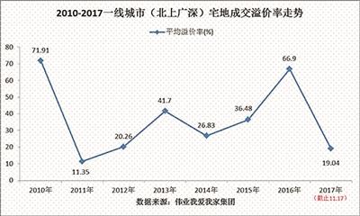 虽然2017年四大一线城市的宅地成交量在增长,但成交的楼面均价、土地均价以及溢价率却在下滑。截至11月17日,北上广深的宅地成交楼面均价为16208元/平米,环比2016年下降2.2%;成交土地均价为32642元/平米,环比2016年下降4.8%;平均溢价率则仅有19.04%,较2016年66.9%的高平均溢价率下降了47.86个百分点,近8年来仅高于2011年的平均溢价率。
