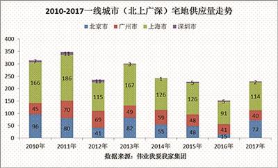据伟业我爱我家市场研究院数据统计显示,截至11月17日,北京、上海、广州、深圳四大一线城市在2017年供应的住宅用地已经达到了228宗,这一数字较2016年全年增长了50%。四大一线城市,尤其是北、上、广三个城市在2017年的宅地供应力度明显加大。