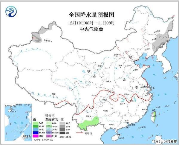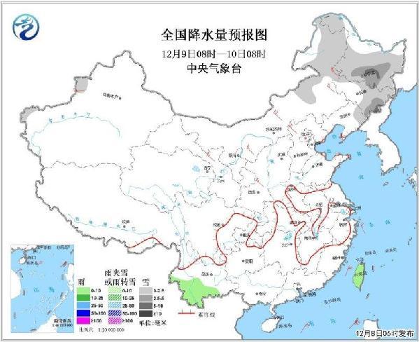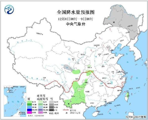 9日08时至10日08时,内蒙古东部、东北地区中北部等地的部分地区有小到中雪,局地大雪。云南西南部、台湾等地有小雨。内蒙古大部、西北地区东部、华北北部等地有4~6级风。巴士海峡、南海东北部有7~8级风、阵风9~10级。