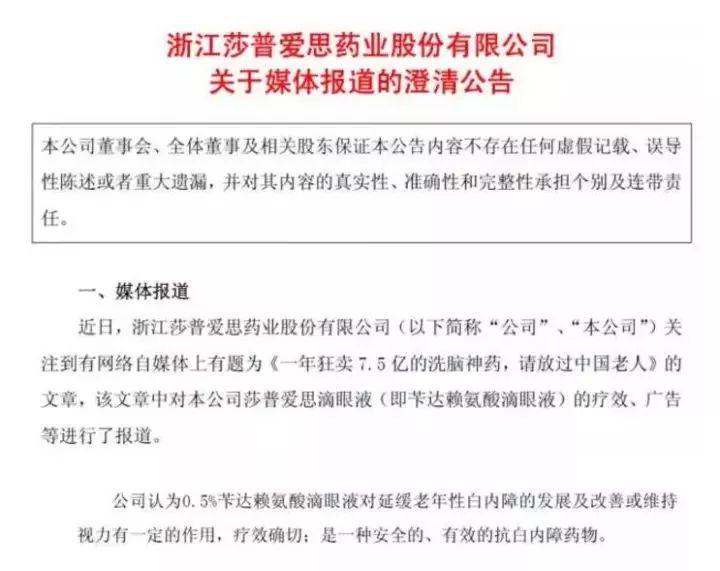 12月2日,一篇名为《一年卖出7.5亿的洗脑“神药”,请放过中国老人》的文章称,多位眼科医生并不认可莎普爱思滴眼液的“白内障防治功效”。质疑者认为,莎普爱思滴眼液是“假科普,真营销”,通过广告误导患者。