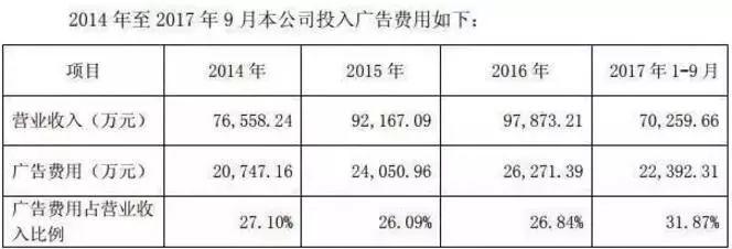 之前媒体发布的文章也对莎普爱思“用各种广告轮番洗脑”的行为予以了质疑。莎普爱思公告的数据显示,2014年度至2017年1-9月,公司的广告费用分别为2.1亿元、2.4亿元、2.6亿元、2.2亿元,分别占公司营收占比的27%、26%、26.84%和31.87%。同业上市公司的广告费用占比基本不会超过20%。