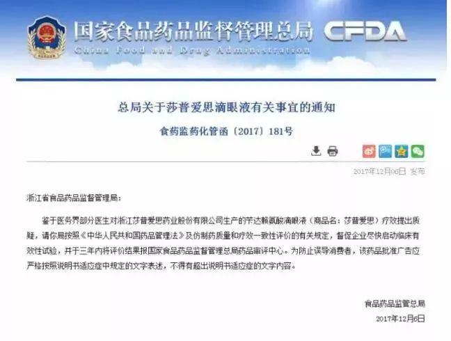 针对医务界部分医生对浙江莎普爱思药业股份有限公司生产的苄达赖氨酸滴眼液(商品名:莎普爱思)疗效提出质疑,国家食药总局昨日在其官网发声,要求浙江省食药局按照《中华人民共和国药品管理法》及仿制药质量和疗效一致性评价的有关规定,督促企业尽快启动临床有效性试验,并于三年内将评价结果报国家食品药品监督管理总局药品审评中心。