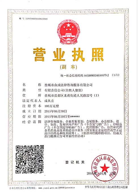 盐城众成法律咨询服务有限公司营业执照