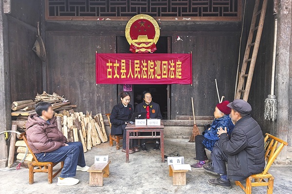 近日,为方便年迈当事人参与诉讼,同时开展普法教育,湖南省古丈县人民法院默戎人民法庭法官走进坪坝镇大寨村,在村民张某家的屋檐下,公开审理了一起相邻关系纠纷案件。庭审结束后,法官就地开展普法宣传,围绕农村地界、历史通道等常见问题,为当事人及村民答疑解惑。图为巡回审判现场。