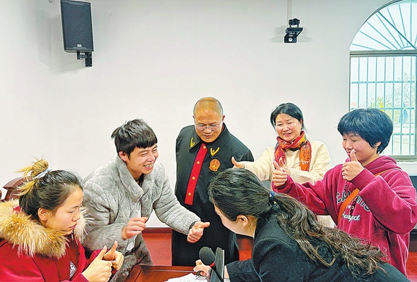 图为双方当事人握手言和后,向法官竖起大拇指。李果 段迪青 龚卓 摄